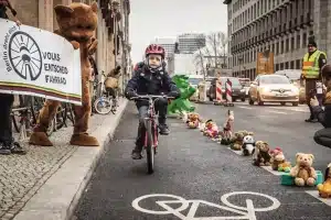 - À Berlin, des manifestants ont aligné des toutous le long d’une piste mal protégée pour rappeler que des enfants utilisent cet espace.