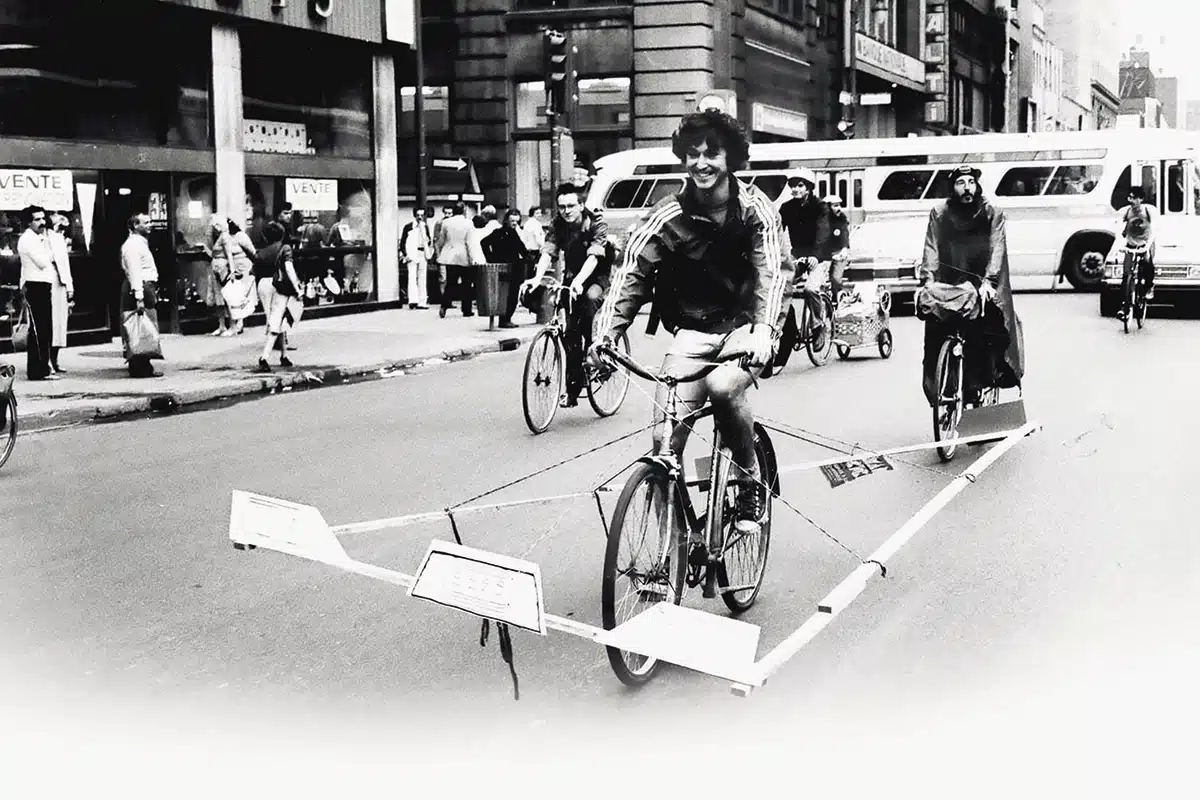Il y a 51 ans naissait le collectif Le monde à bicyclette (MAB). Porté par une poignée de cyclistes à l’imagination fertile, le MAB a été réputé pour ses actions théâtrales. Die-in (où des gens prétendent être morts en s’allongeant dans la rue), déguisements (notamment pour obtenir le droit d’emporter son vélo dans le métro) et événements drolatiques étaient monnaie courante à une certaine époque : pour illustrer le besoin des cyclistes de traverser les ponts vers la Rive-Sud, Moïse est allé ouvrir les eaux du fleuve Saint-Laurent ; pour souligner l’absurdité de rouler seul en voiture en plein centre-ville, quelques cyclistes se sont munis d’un cadre en bois large comme un véhicule et sont allés se coincer dans le trafic.