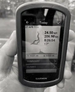 De retour en banlieue, sur la Rive-Sud, les pistes cyclables s’enchaînent jusqu’au dernier arrêt, un autre dépanneur où le temps officiel est noté pour être envoyé à l’organisme parisien qui les enregistrera. Avec les pauses, mon chrono indique 9 h 45. Quelques kilomètres plus loin, Benoit et moi retrouvons son camion. J’ai une moyenne de 24,5 km/h et 207 km au compteur – ma plus longue distance à vie. J’ai les jambes molles, mais le mental un peu plus dur… et étrangement, déjà une pointe d’envie de m’essayer la prochaine fois à une plus longue distance…