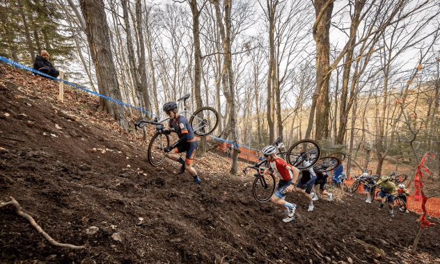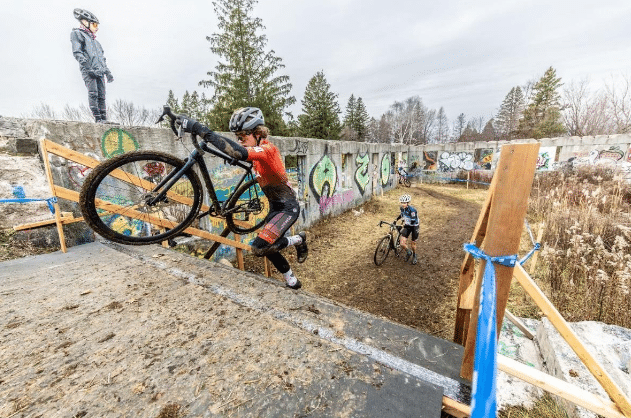 « La course se déroule dans un parc municipal à Saint-Romuald, sur l’ancien domaine d’une abbaye, détaille Blais. Le sol travaillé (anciennes terres/vergers) est souple, sans roches : parfait pour tracer, drainer et virer serré. En novembre, ça devient boueux, donc technique, avec sections rapides, de longs tirants et de vrais run-ups (on descend du vélo et on court). En prime, on a une vue imprenable sur le fleuve et les ponts de Québec, et plusieurs points de vue d’où l’on voit presque tout le parcours. »