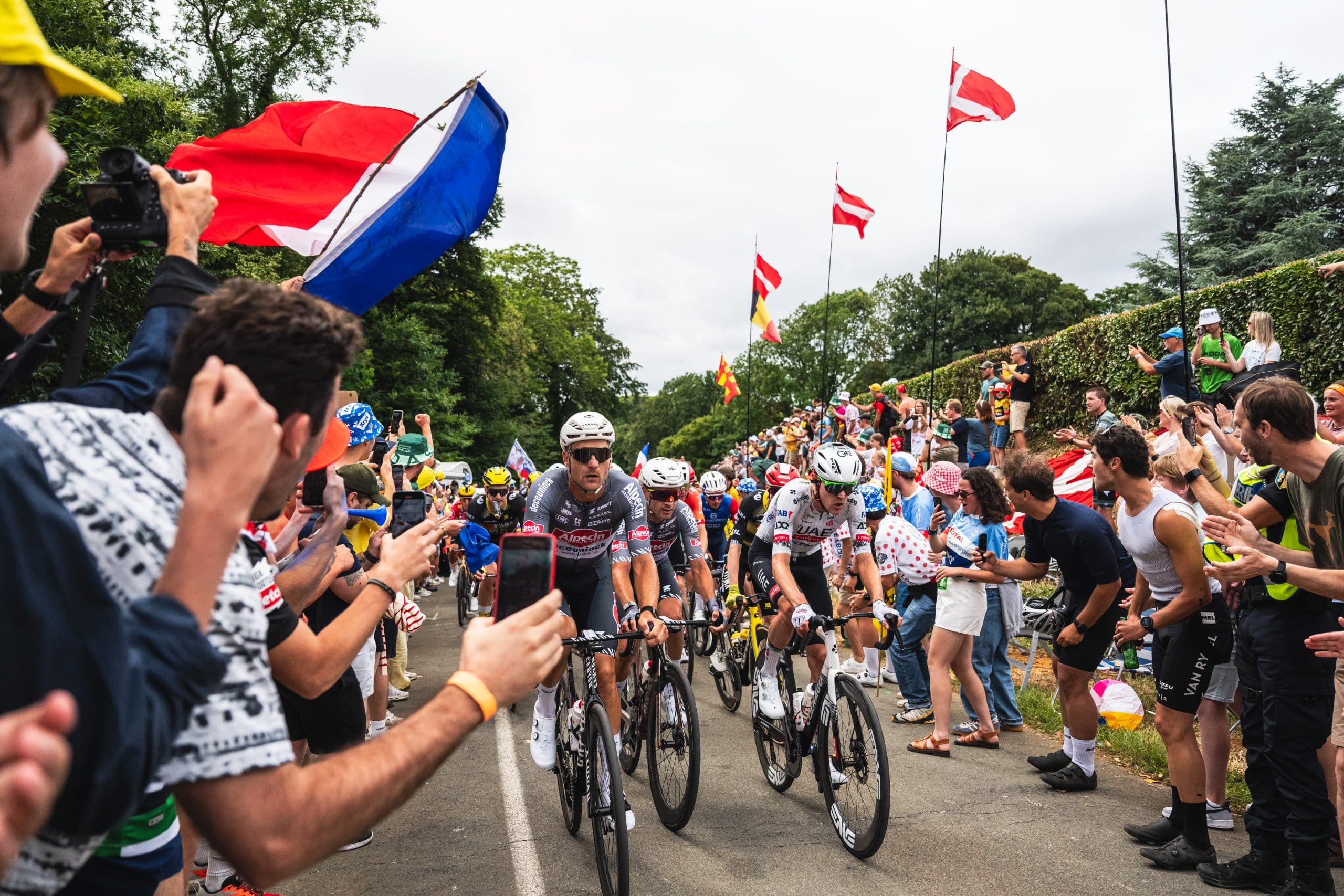 Je suis parti dans ce genre de chaleur écrasante qui n’était cependant pas pour éteindre l’enthousiasme des spectateurs. Sur mon itinéraire, j’empruntais un long segment plat du parcours du jour. Partout, il y avait des caravanes, des enfants, des familles, des tables pliantes, des drapeaux, des pancartes. C’était jeudi. On aurait dit qu’ils avaient fermé la région pour le passage du Tour.