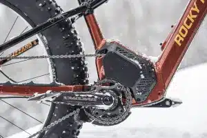 À la différence de la majorité des fabricants de vélos, Rocky Mountain a développé sa propre motorisation. Certes, cela a demandé un travail supplémentaire considérable, mais ça a le grand avantage d’ajuster le duo moteur-batterie au vélo, et non le contraire. Avant d’équiper le Blizzard, le Dyname 4.0 a déjà fait ses preuves sur l’Instinct, le Fusion et l’Altitude, cependant, c’est la première fois qu’il affronte des conditions hivernales sur un fatbike. Le moins qu’on puisse dire, c’est que l’adaptation s’est faite sans problème, en grande partie grâce au couple du moteur, de 108 Nm, un des plus puissants de l’industrie, accompagné par une puissance maximale du moteur de 700 W. Quand on a besoin d’une bonne poussée afin de franchir un obstacle ou une pente abrupte, le Blizzard répond présent tant que le pilote arrive à garder de l’adhérence. Le vélo n’a pas pour autant un comportement de brute. Équipé d’un capteur de couple qui mesure la tension de la chaîne, il livre précisément et sans délai la puissance adaptée à la situation. À noter qu’en dépit de sa puissance, le Dyname 4.0 se montre plutôt discret autant d’un point de vue sonore que visuel.