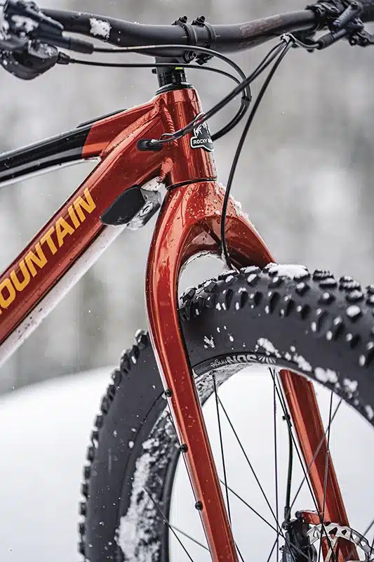 Fourche en carbone comportant des points de fixation, pneus Vee avec des clous rajoutés : ce Rocky Mountain a tout ce qu’il faut pour l’aventure hivernale.