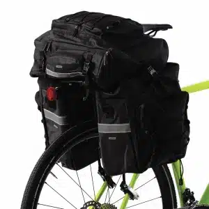 Cette sacoche multifonctionnelle combine trois sacs au design unique. Une fois enlevés du support, les deux sacs latéraux se portent en bandoulière et le sac du dessus devient un sac à dos. L’espace de rangement totalise 75 L. Une housse pour la pluie est incluse. • Voir le prix