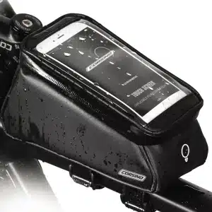 Bien qu’on puisse l’installer à différents endroits sur le vélo, c’est sur le tube supérieur qu’on vous suggère de placer ce sac, afin de ne jamais perdre de vue votre précieux téléphone, placé dans le compartiment supérieur doté d’un film tactile transparent. Le sac a une capacité de 1,5 L et résiste à l’eau, mais en cas de grosse pluie, une housse étanche est incluse. • Voir le prix