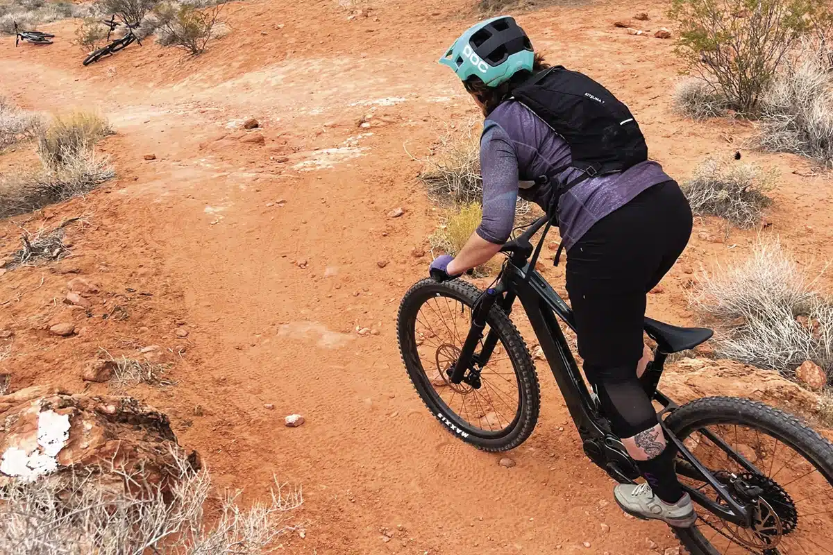 On ne le dira jamais assez : reculer ses fesses n’est pas la chose à faire. On veut que ce soit le vélo qui bouge et non le cycliste. Avoir le poids dans les pieds est la première étape, mais pour laisser le vélo travailler, il est essentiel que les jambes et les bras soient mobiles. N’oublions pas que nos membres sont notre meilleure suspension ! En terrain technique, des membres statiques se traduisent par un manque de stabilité et de direction.