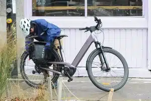 Un vélo à assistance électrique avec une paire de sacoches imperméables permet d’affronter n’importe quelle situation.