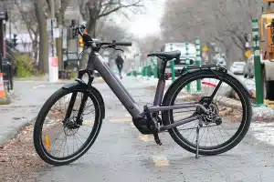 Parlons maintenant des contraintes et limites subies. D’abord, le poids du vélo, qui est d’environ 27 kg, sans compter mes sacoches et ce dont j’ai besoin pour la journée : ordinateur, lunch, vêtements, etc. Disons que c’est moins manœuvrable que mon petit vélo habituel. Au début, j’ai souvent eu recours à de l’aide pour le monter à l’étage au bureau. Embarquer mon vélo sur le train ou l’autobus a été tout aussi compliqué en raison de son poids et du manque d’infrastructures adéquates. Cela contraint grandement la combinaison des modes de transport et la possibilité de faire un aller simple. On doit également penser à un support à vélo adapté à un VAE de ce poids sur sa voiture si on envisage de l’emporter en vacances. Les points positifs de sa stature, cependant : la visibilité, autant pour moi que pour les autres, ainsi que sa robustesse. Tant l’ergonomie que la suspension et la solidité de sa construction m’ont apporté une entière confiance quand je roulais sur les chaussées inégales de la ville. Il a parfois été un peu malmené, et sa réponse a chaque fois été pleinement satisfaisante.
