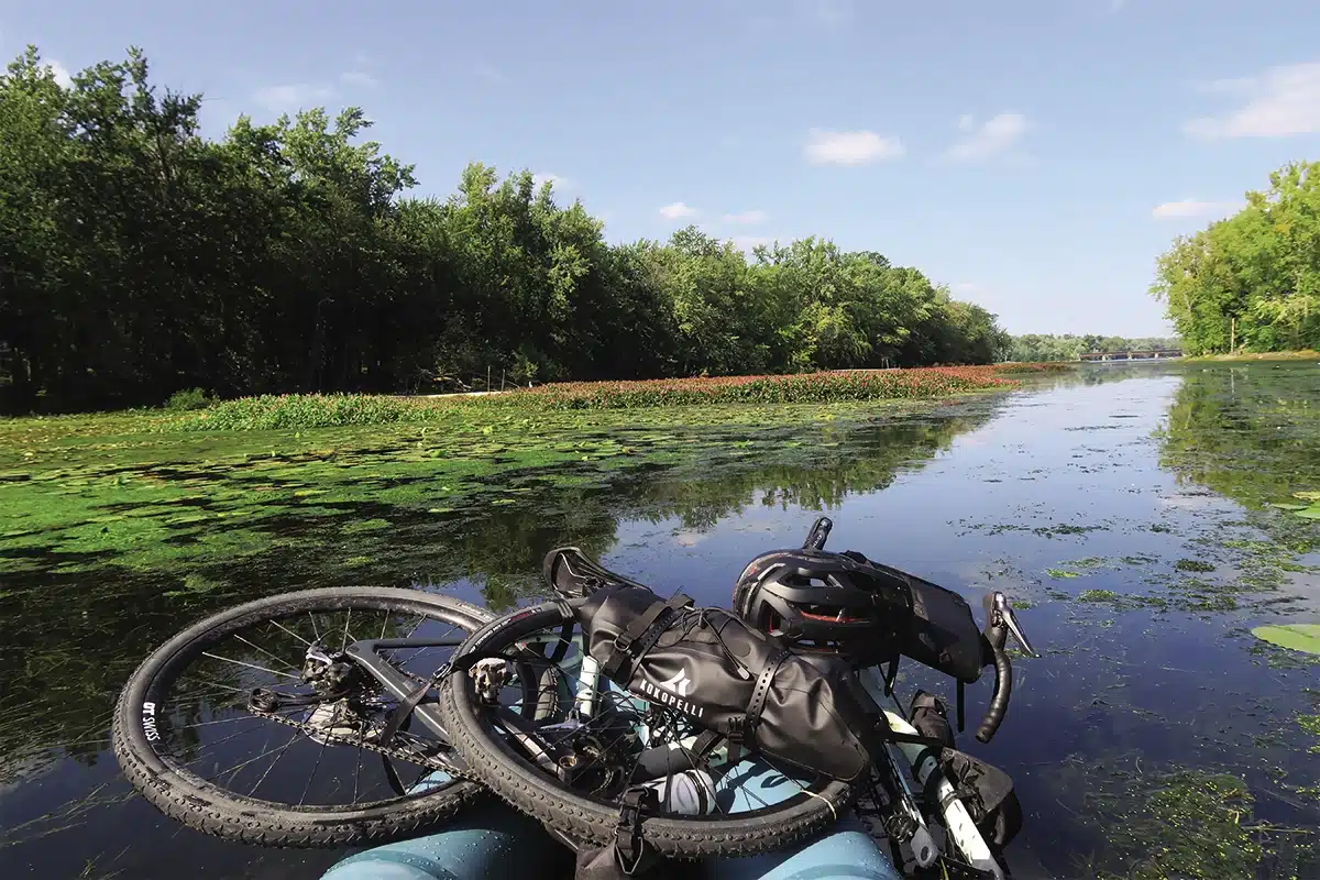 Je roule bien serré mon canot gonflable Kokopelli Twain-Lite afin de l’installer dans son support sur mon guidon. À l’arrière, dans un sac de selle, j’ai tout ce qu’il faut pour la partie navigation : une pagaie démontable, le sac de gonflage, un gilet de sauvetage, un pique-nique… L’ensemble prend de la place, mais le vélo reste facilement manœuvrable.