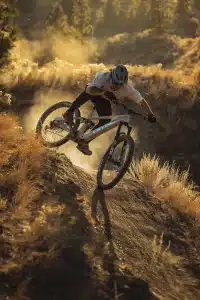 La suspension Split Pivot fonctionne bien, notamment dans les sections rapides où le vélo reste stable étant donné son ajustement adéquat, et sans doute aussi compte tenu de son poids. Dans les parties techniques, le débattement (160 mm à l’avant et 150 mm à l’arrière) et les roues mixtes facilitent le travail du pilote. Lors de la première prise en main, si on vient directement d’un vélo musculaire léger, il faudra se faire à la maniabilité plus pesante, mais on s’habitue vite. Concrètement, un sentier assez technique connu d’environ 4 km se fait d’un bout à l’autre plus rapidement et sans mettre le pied au sol alors qu’en version musculaire, certains passages le nécessitent. Le mode d’assistance Eco est le plus souvent utilisé, en outre de quelques passages en eMtb pour les sections les plus techniques. Autre constat : l’énergie préservée grâce à l’assistance du moteur permet aisément de doubler à la fois la distance parcourue et la durée de la sortie.