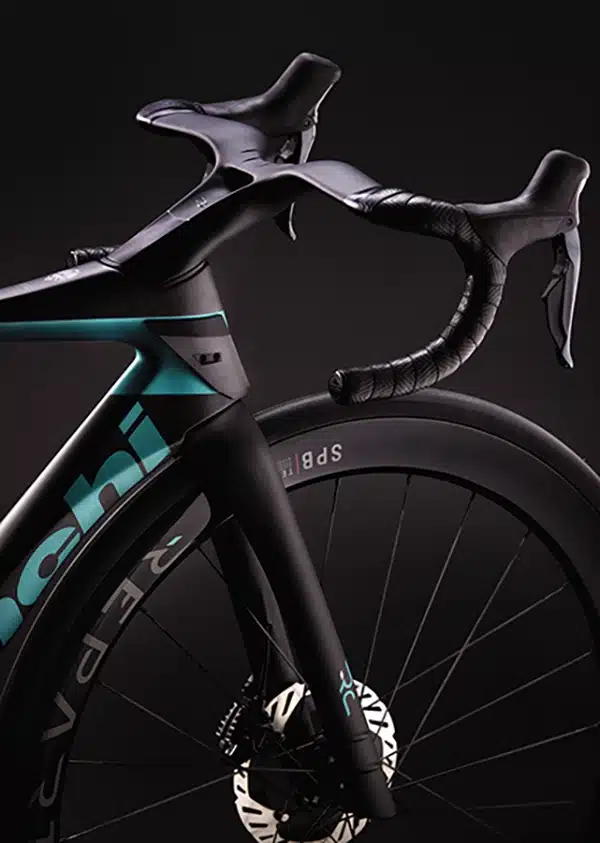 La fluidité des lignes du Oltre est portée au plus haut degré, de façon à favoriser son aérodynamisme. C’est particulièrement réussi sur le plan du design du guidon, qui fait partie intégrante du vélo. La version 2025 arbore sa nouvelle teinte vert céleste métallique mixée de noire, ajoutant à la distinction du bolide piloté par les coureurs de l’équipe Arkéa-B&B Hotels.